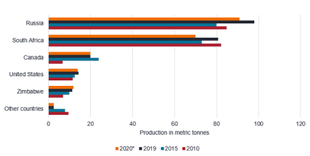 Grafik: Russland ist weltweit führender Palladium-Produzent Weltweite Minenproduktion von Palladium von 2010 bis 2020, nach Ländern (in metrischen Tonnen)Image